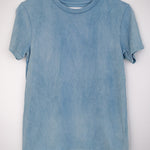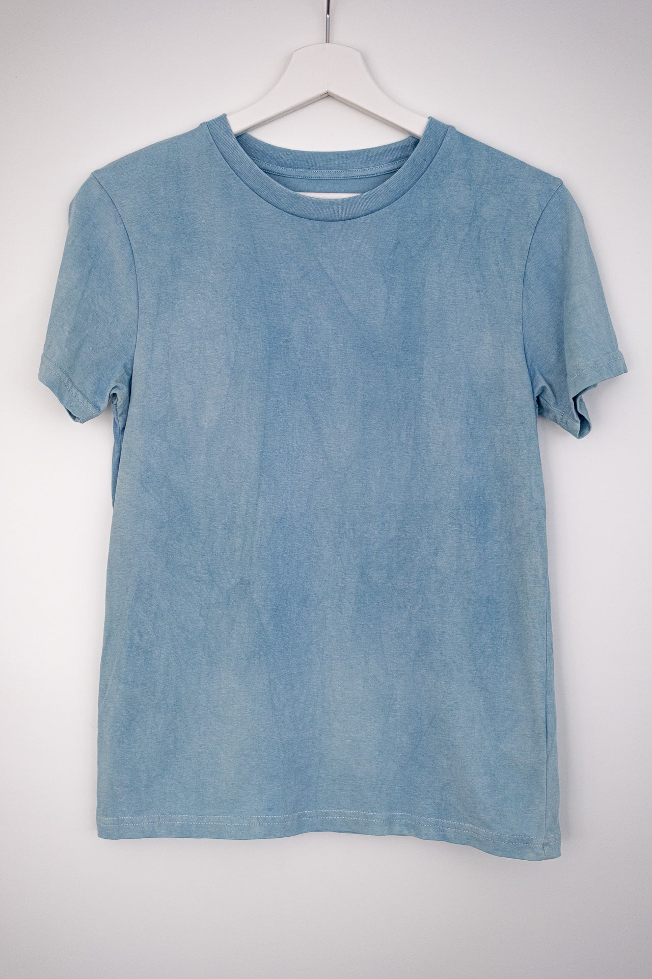 Hier siehst du die Verwandlung eines weißen Basic T-Shirts durch unseren Indigo-Färbeservice. Das Ergebnis: Ein gleichmäßiger, heller Indigoblau-Ton, der mit der Zeit seinen ganz eigenen Charakter entwickelt.