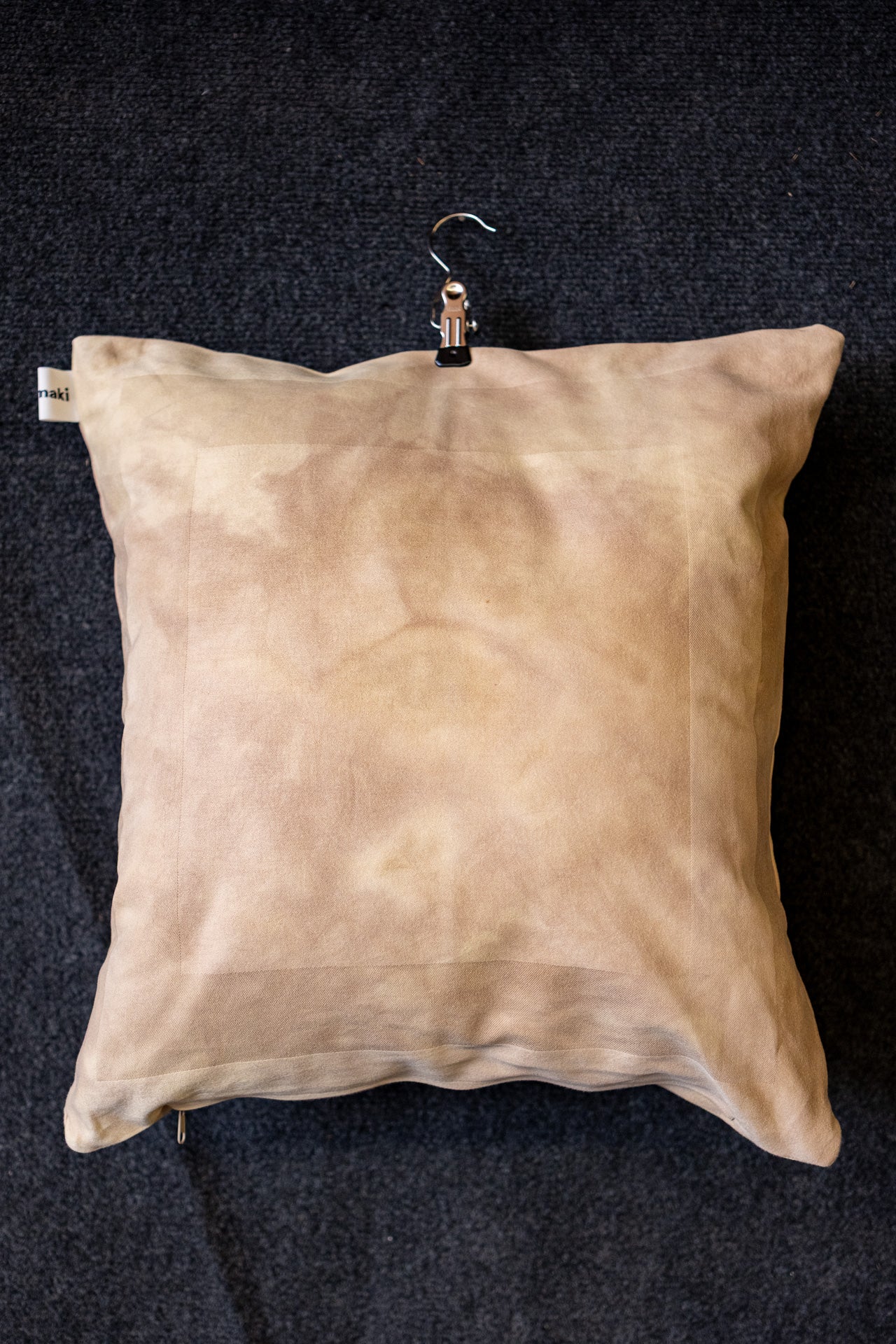 Ein Kissenbezug mit Charakter: Gefertigt aus ausrangierten Hotelservietten und mit Granatapfelschalen natürlich gefärbt. Jeder Bezug ist ein Unikat mit individueller Farbstruktur.