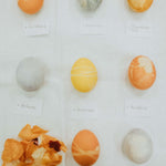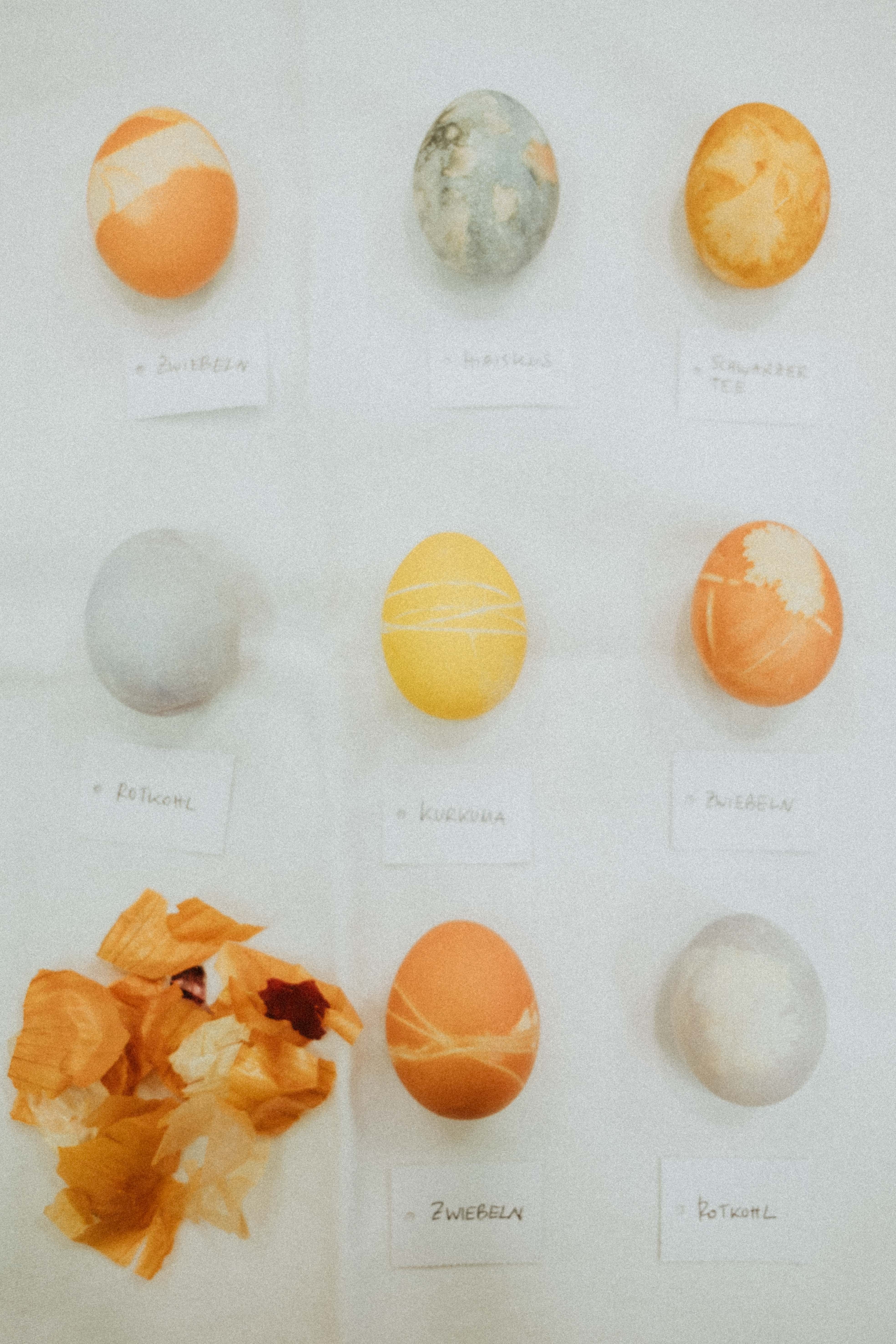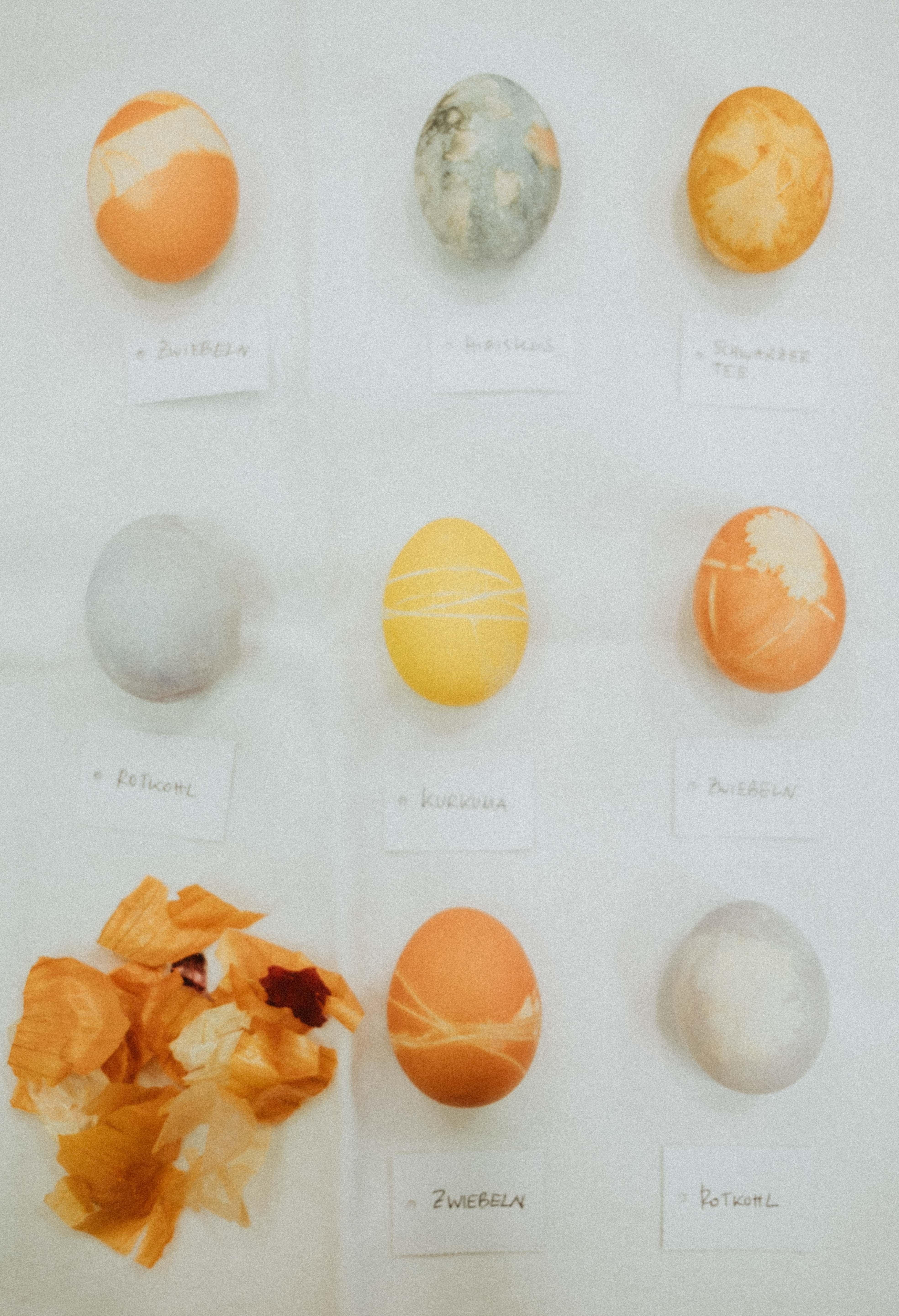 Wir färben Eier mit Pflanzenfarben wie Kurkuma, Hibiskus, schwarzem Tee, Zwiebelschalen, Avocadokernen und Granatapfelschalen. Mit kleinen Blättern, Samen oder Rinden lassen sich die Eier zusätzlich verzieren.
