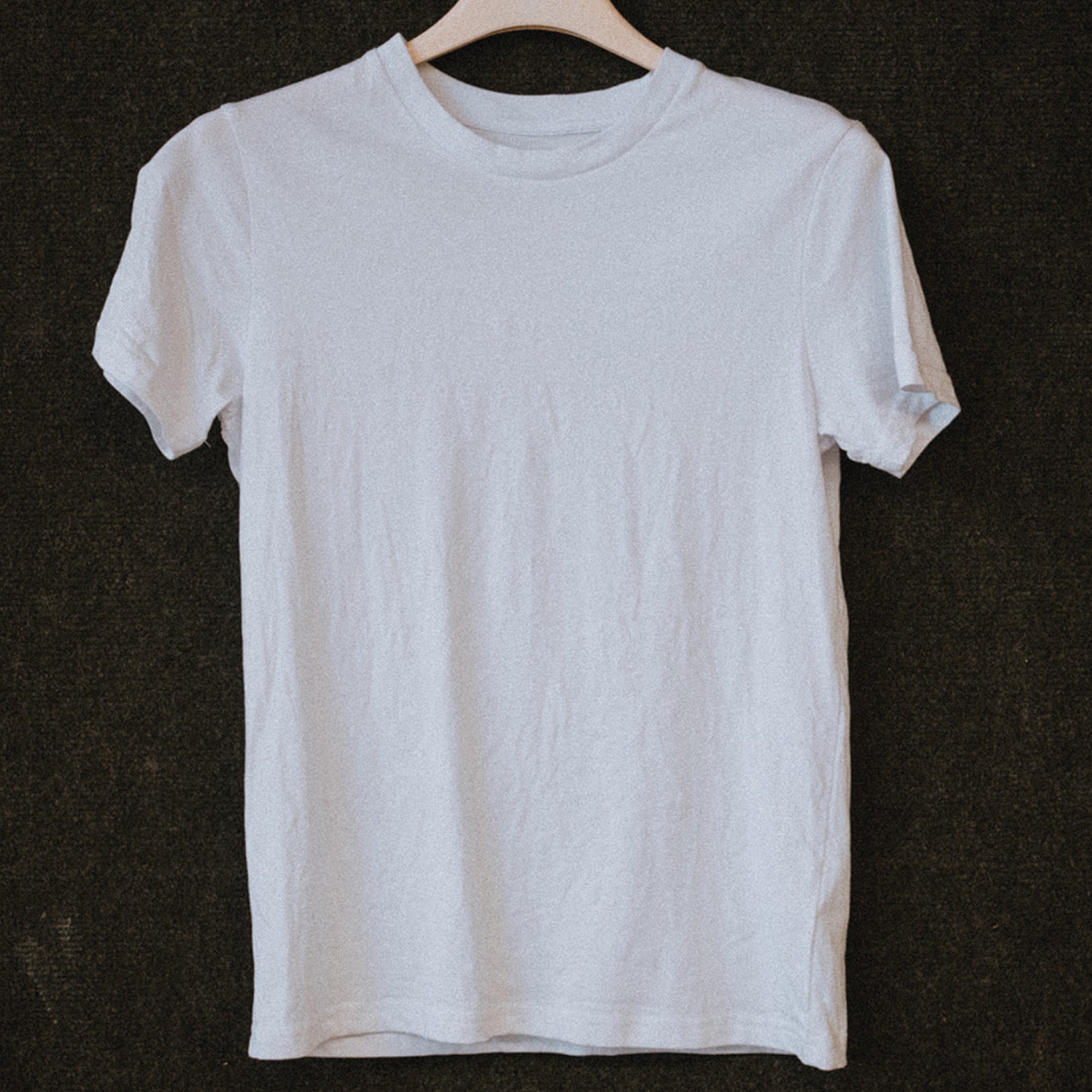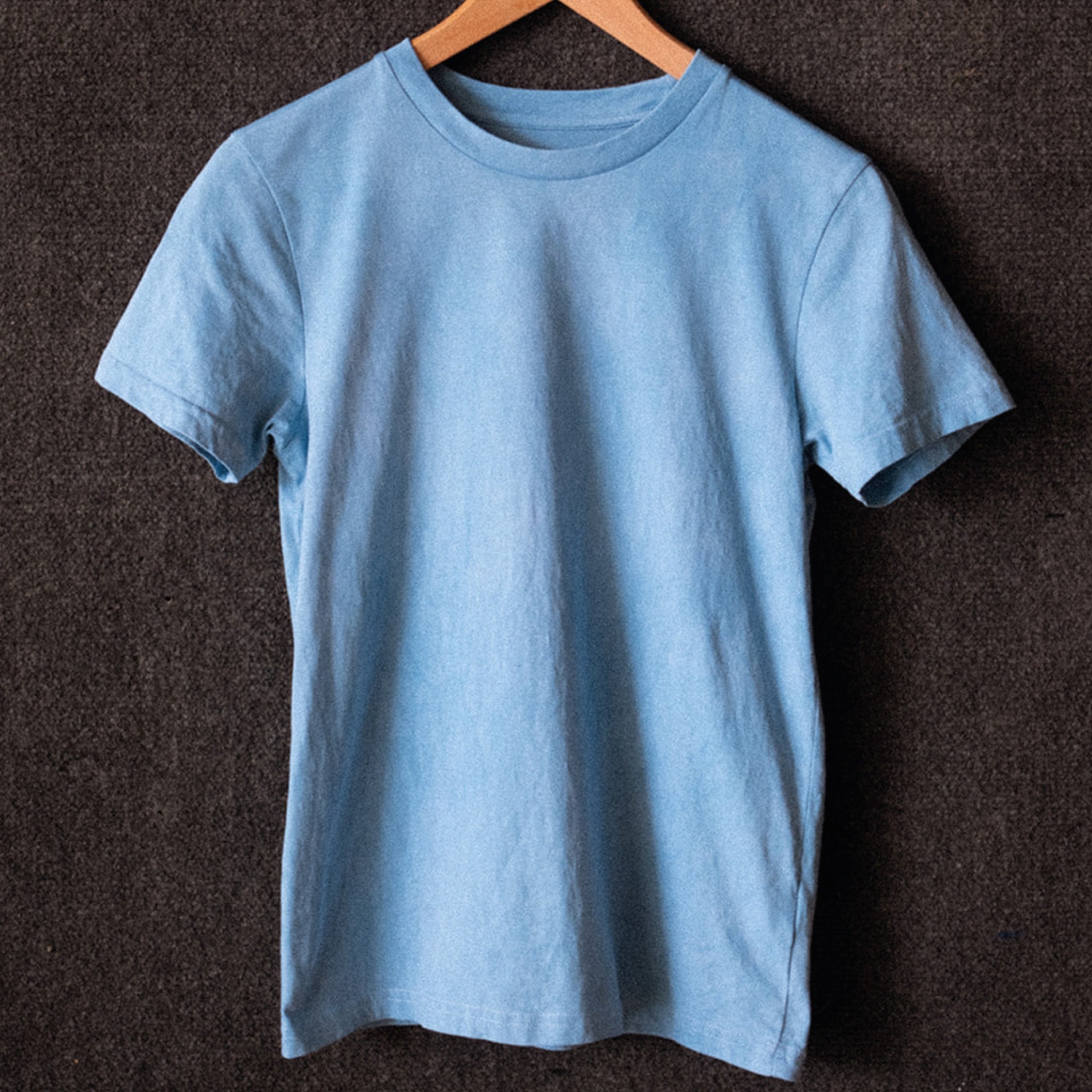 Here you can see the transformation of a basic white T-shirt through our indigo dyeing service. The result: an even, light indigo blue tone that develops its own character over time.